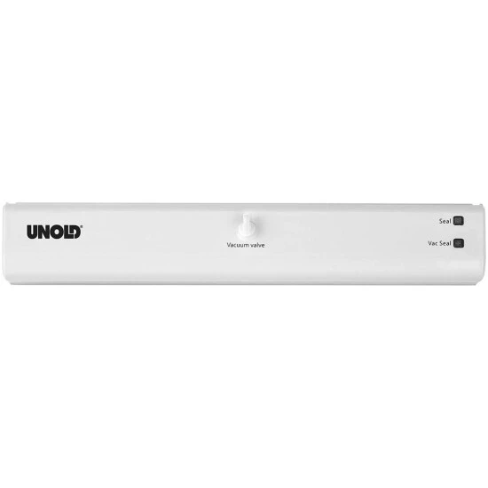 Der VAKUUMIERER Kompakt hat die Power, um Lebensmittel perfekt zu vakuumieren oder auch zu verschweißen. Die Bedienung ist kinderleicht. Das Gerät ist zudem so gestaltet, dass es platzsparend in jeder Schublade untergebracht werden kann. Wahlweise wird verschweißt oder verschweißt und vakuumiert – ein Knopfdruck genügt! Die Funktionskontrollleuchten zeigen an, welcher Arbeitsvorgang gewählt wurde. Im Lieferumfang enthalten ist ein Schlauch, mit dem Dosen und Flaschen vakuumiert werden können und eine Ersatzdichtung. Das optionale Zubehör wie z.B. Dosen, den Flaschenverschluss, Folienbeutel und Folienrollen in verschiedenen Größen gibt es ebenfalls von Unold®, Optional erhältlich.