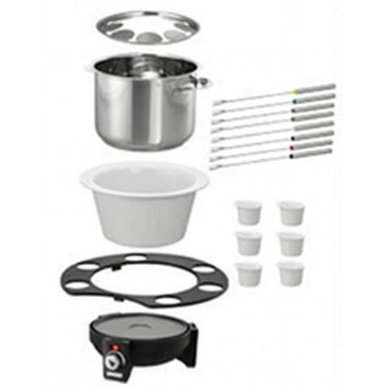 – Material: Edelstahl – Edelstahl-Fonduetopf mit Sandwichboden für Fleischfondue – Edelstahl-Spritzschutz mit Gabelhalterung – Mit zusätzlichem, feuerfestem Keramiktopf für Schokoladen- oder Käsefondue – Cool-Touch – wärmeisoliertes Heizteil, auch verwendbar als Kochplatte für Töpfe bis 16 cm Ø – Stufenlose Temperaturregelung – Kunststoffring mit 6 Keramiktöpfchen – Alle nicht elektrischen Teile sind spülmaschinengeeignet – 8 Fonduegabeln – Farbe: Schwarz
