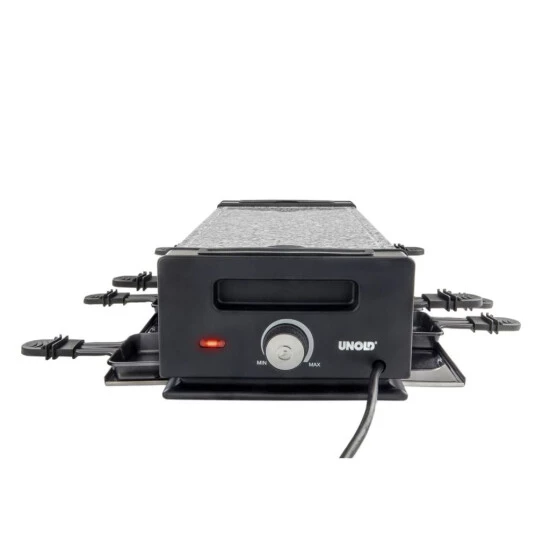 Mit dem Raclette Finesse Basic kommt kulinarische Vielfalt für bis zu acht Personen auf den Tisch. Denn außer den acht antihaftbeschichteten Pfännchen sowie auch acht Kunststoffspateln gehören zwei Grillplatten zur Ausstattung: eine aus Naturstein und eine wendbare aus Druckguss-Aluminium mit glatter bzw. geriffelter Oberfläche. Ausgestattet mit einer hochwertigen Greblon-Antihaftbeschichtung ist diese bequem zu reinigen. Ob Käse zart schmelzen, Steaks scharf angebraten oder Gemüsescheiben gegrillt werden sollen: Mit 1200 W sorgt die stufenlose Temperaturregelung mit Kontrollleuchte immer für die perfekte Hitzeentwicklung des Heizelements aus Edelstahl. Praktisch ist die ausziehbare Edelstahl-Pfännchenablage: Auf ihr können bei einer Raclette-Pause die Pfännchen abgestellt werden. Auf den Antirutschfüßen hat das Raclette mit integrierter Kabelaufbewahrung immer einen sicheren Stand.
