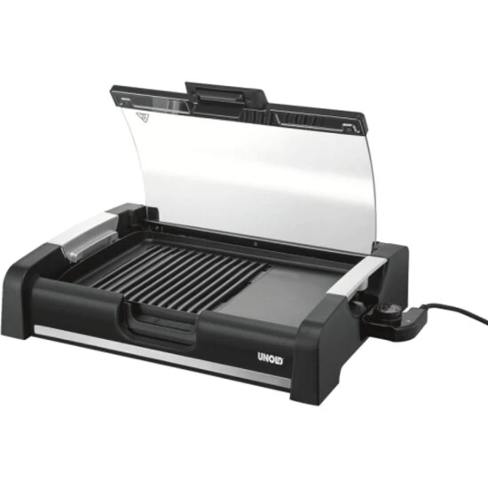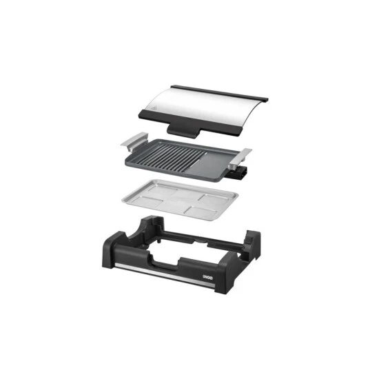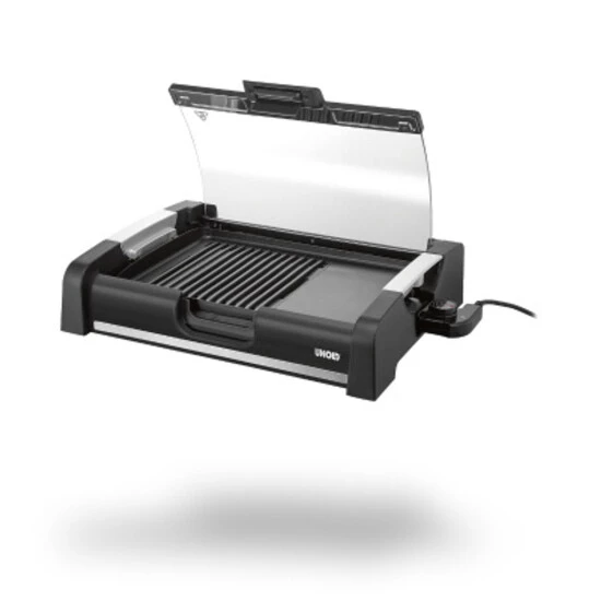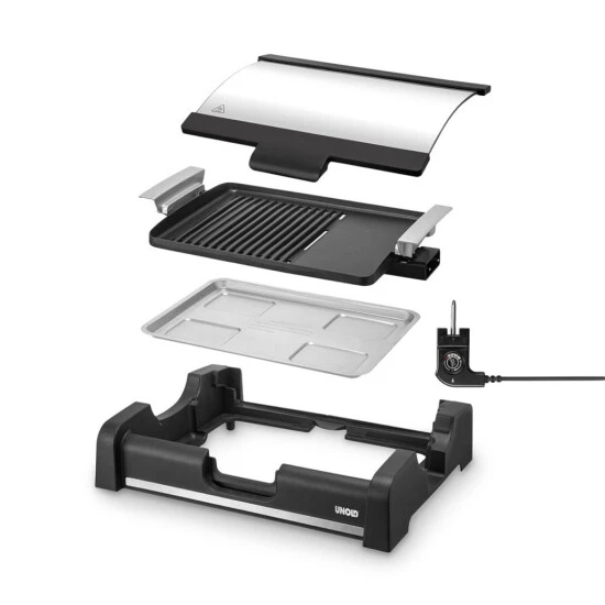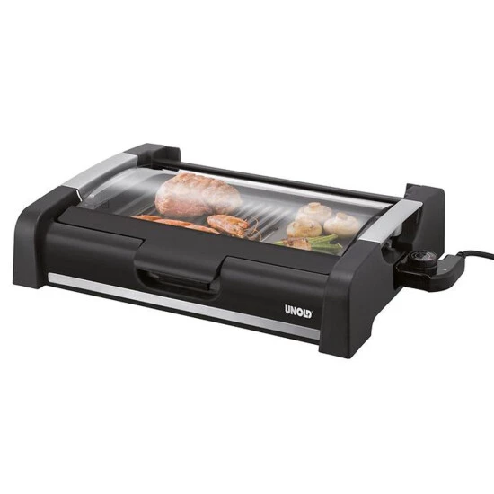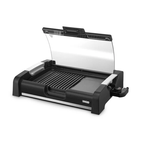 Grillen direkt am Tisch. Kohle ist tabu und du hast wenig Platz, aber Lust zu grillen? Der praktische Barbecue-Grill Edel von Unold schafft Abhilfe: Der Tischgrill ist besonders kompakt und sorgt mit Deckel für sauberes Grillvergnügen auf kleinem Raum. Extra kompakt: Mit 45,6 x 34,2 x 10,9 cm braucht der praktische Tischgrill nur wenig Platz. Volle Leistung: 1.650 Watt, 220-240 V und 50/60 Hz bieten ordentlich Grillpower. Die kombinierte Grillfläche bietet auf großzügigen 35,4 x 25,4 cm beide Oberflächen – geriffelt und glatt. Die keramische Antihaftbeschichtung macht das Wenden von Grillgut leicht – da klebt nichts fest. Optimale Hitze: Der Temperaturregler ermöglicht eine Grilloberflächentemperatur bis ca. 210 °C. Voller Durchblick: Der abnehmbare Glasdeckel mit Sicherheitsverriegelung dient als Spritzschutz. Leicht und hygienisch, dank schwarzem Kunststoffgehäuse. Mit 85 cm langem Kabel erreichst du auch abgelegene Steckdosen. Einfache Reinigung dank entnehmbarer Grillplatte und Fettauffangschale. Nach dem Grillen die einzelnen Teile einfach per Hand reinigen. Einfach verstaut: Du kannst den Tischgrill komplett zerlegen.