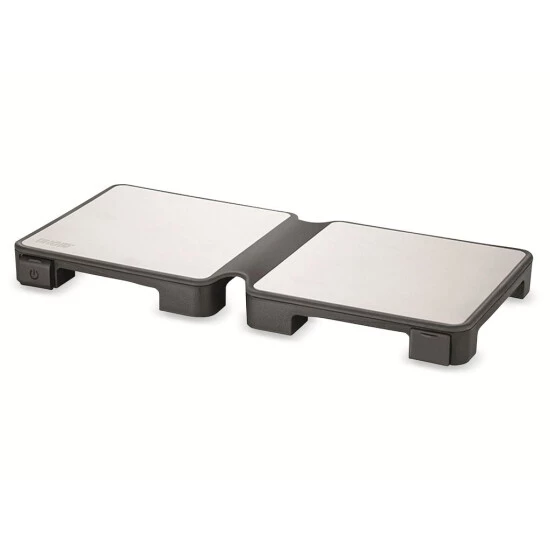 Mitgeliefert wird ein Verbindungskabel, mit dem sich bis zu fünf der Doppelplatten hintereinander kombinieren lassen. Mit Funktionskontrollleuchten, Überhitzungsschutz und Antirutschfüßen. 230 V.