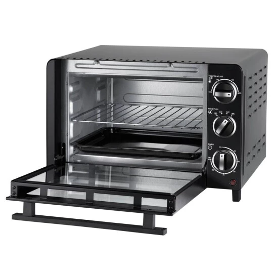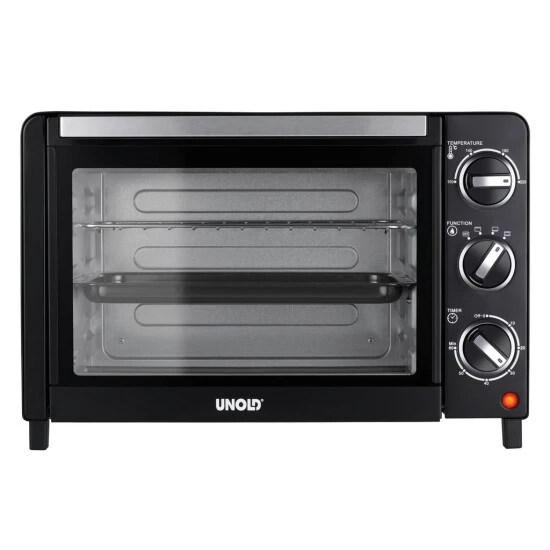Der Mini-Backofen Allround bietet mit circa 18 Litern reichlich Platz zum Backen und Gratinieren. Für ein delikates Kartoffelgratin, würzige Pizza, aromatische Lasagne oder zum Warmhalten von Schnitzel, Frikadellen & Co. stehen die einstellbaren Temperaturen von 100°C bis 220°C zur Verfügung, die mit 1.200 Watt flott erreicht sind. Wahlweise können nach Bedarf Ober- und Unterhitze oder beides zusammen eingestellt werden. Der perfekte Servierzeitpunkt wird ganz einfach mit dem 60-Minuten-Timer festgelegt. Das akustische Fertigsignal und die Abschaltautomatik sorgen dafür, dass nichts anbrennt. Die verschiedenen Einschubebenen erlauben den gleichzeitigen Einsatz von Backblech und Grillrost im Ofen. Beide sind ebenso wie der Grillrostheber und die Bedienungsanleitung mit allerlei Rezeptideen im Lieferumfang enthalten. Das hitzeisolierte Außengehäuse und die doppelverglaste Tür helfen Energie zu sparen. Zur Sicherheit gibt es natürlich eine Betriebskontrollleuchte.