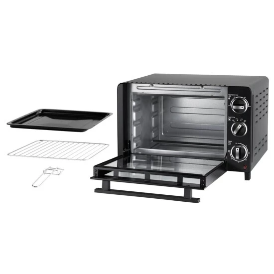 Im circa 18 Liter fassenden Innenraum bietet der OFEN Allround Platz für Pizza, Backformen & Co.! Mit der einstellbaren Temperatur von 100°C bis 220°C ist er für alle Backfälle gerüstet. Dabei können Ober- und Unterhitze separat, aber auch gemeinsam in Aktion treten. Das schwarze Außengehäuse ist entsprechend der neuesten EU-Norm hitzeisoliert. Durch die doppelverglaste Tür hat man alles im Blick. 60-Minuten Timer und akustisches Fertigsignal sorgen dafür, dass nichts anbrennt. Das Zubehör: Grillrost, Grillrostheber, Backblech und Bedienungsanleitung mit Rezepten.