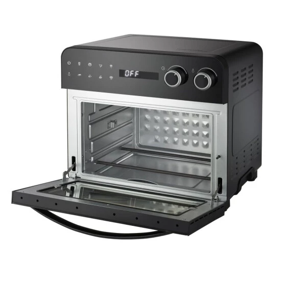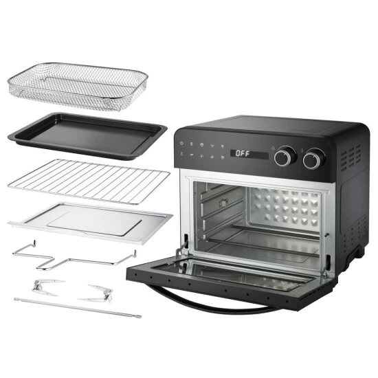 3 nutzbare Garebenen, 8 Automatikprogramme: Pizza, Pommes Frites, Brot, Drehspieß, Steak, Kuchen, Aufwärmen und Dörren, 6 Edelstahl-Heizelemente, diamantförmige Rückwand zur besseren Luftzirkulation, ideal für große Pizzen bis zu ca. 26 cm Ø, Backraumgröße ca. 33×30,5×19 cm, akustisches Fertigsignal, Temperatur von 40° C bis 230 °C, Timerfunktiong, roßes, digitales Touchscreen-Bedienfeld, LED-Display mit Anzeige der Temperatur und Zeit, Gerätefront und großes Sichtfenster aus Glas, Innenraumbeleuchtung, doppelverglaste Tür, entnehmbares Fettauffangblech, Zubehörteile spülmaschinengeeignet, 1700 W, schwarz, Zubehör: Grillrost, Grillrostheber, Backblech, Frittierkorb, Drehspieß mit Halteklammer, Bedienungsanleitung mit Rezepten