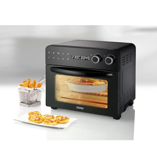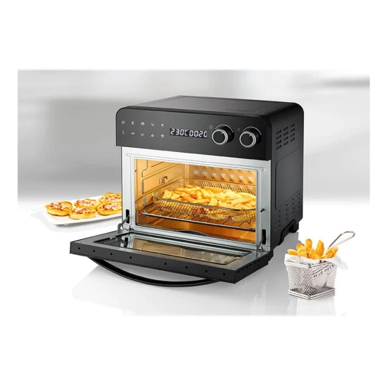 Der kompakte Küchenassistent mit seinen 3 Garebenen hat 8 Automatikprogramme zu bieten: Pizza, Pommes Frites, Brot, Drehspieß, Steak, Kuchen, Aufwärmen und Dörren. Im großzügigen Backraum finden auch Pizzen bis ca. 26 cm Durchmesser Platz. Entsprechend der neusten EU-Norm ist das Außengehäuse energiesparend hitzeisoliert. Auf dem großen, digitalen Touchscreen-Bedienfeld kann das gewünschte Programm und ein Timer für 1 bis 5 Stunden ausgewählt werden. Das LED-Display informiert über Temperatur und Zeit. Durch das große Sichtfenster aus Glas und die Innenbeleuchtung hat man den Garvorgang immer bestens im Blick. Ein akustisches Fertigsignal sorgt dafür, dass nichts anbrennt.Das spülmaschinengeeignete Zubehör lässt keine Wünsche offen: Neben Grillrost und Grillrostheber gibt es ein Backblech, einen Frittierkorb, einen Drehspieß mit Halteklammern – und inspirierende Rezepte sind in die aussagekräftige Bedienungsanleitung integriert.
