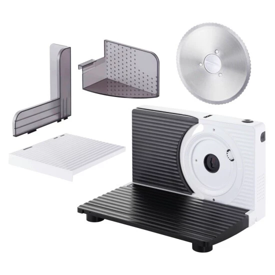 Zusammenklappbarer Allesschneider, entnehmbares Edelstahl-Wellenschliffmesser (ca. Ø 17 cm), Schnittbreite stufenlos einstellbar von 0 bis ca. 15 mm, Sicherheitsschalter mit Kindersicherung, Abnehmbarer Restehalter mit Fingerschutz, mit Kabelaufbewahrung, Antirutschfüße zum sicheren Stand, BPA-frei, Leistung: 100 W, 220-240 V, 50/60 Hz, Kabel: ca. 135 cm