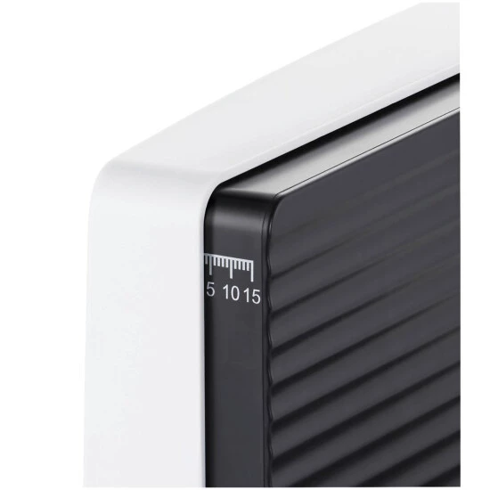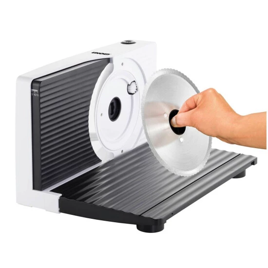 Mit dem einfach entnehmbaren Edelstahl-Wellenschliffmesser (ca. 17 Zentimeter Durchmesser) liefert der ALLESSCHNEIDER Curve White gleichmäßige Scheiben. Ob hauchfein bei Salami, Schinken und Co. oder dicker für knusperfrisches Brot oder köstlichen Braten: Die Schnittbreite kann stufenlos von 0 bis 15 Millimeter eingestellt werden.