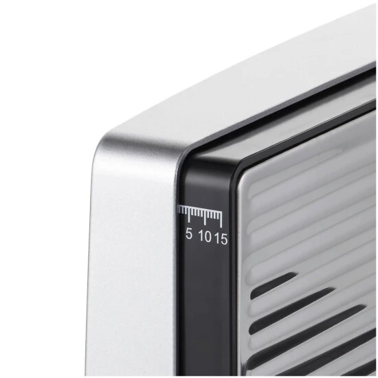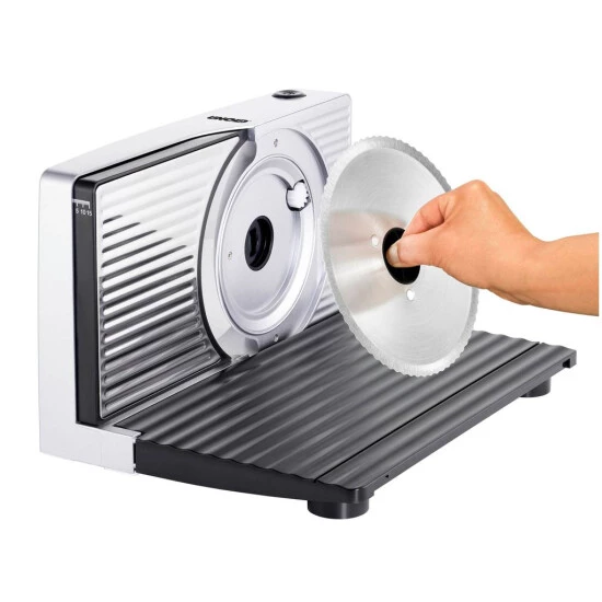 Mit dem einfach entnehmbaren Edelstahl-Wellenschliffmesser (ca. 17 Zentimeter Durchmesser) liefert der ALLESSCHNEIDER Curve Silver gleichmäßige Scheiben. Ob hauchfein bei Salami, Schinken und Co. oder dicker für knusperfrisches Brot oder köstlichen Braten: Die Schnittbreite kann stufenlos von 0 bis 15 Millimeter eingestellt werden.