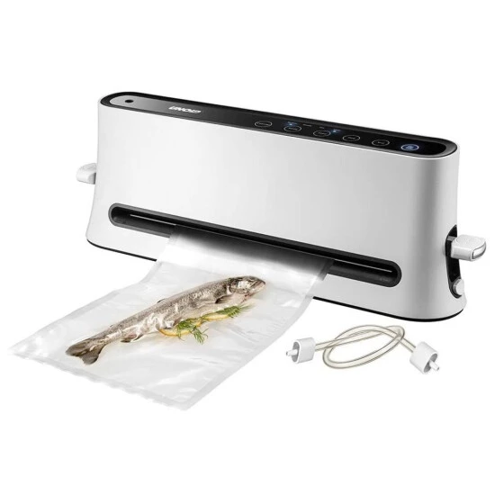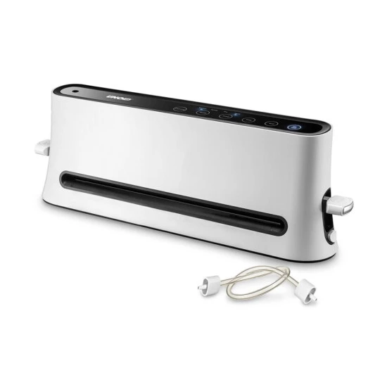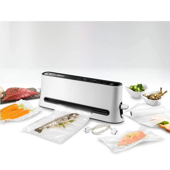 Fünf 20 x 30cm-Folienbeutel und eine 200 x 20 cm-Folienrolle sind im Lieferumfang enthalten. Sie sind doppelwandig und spülmaschinengeeignet, deshalb wiederverwendbar. Zum schwarz-weißen VAKUUMIERER Design mit integrierter Kabelaufbewahrung gehört auch ein Schlauch, mit dem ebenfalls erhältliche Spezial-Dosen und -Flaschenverschlüsse angeschlossen werden können.