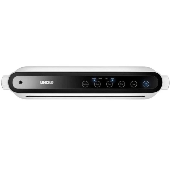 Frische und leckere Speisen, auch nach dem Aufbewahren. Halte deine Lebensmittel länger frisch oder gare sie aromaschonend mit einem Sous-Vide-Garer – mit dem Vakuumierer Design 48040 von Unold ist das alles möglich. Platz satt: Für Vakuumierbeutel mit einer Breite bis 28 cm geeignet. Erzeugt eine stabile Schweißnaht: ca. 2,5 mm. Direkt loslegen: 5 Folienbeutel und 1 Folienrolle inklusive. 110 Watt sorgen für ein schnelles Ergebnis. Die leistungsstarke Pumpe entzieht dem Beutel mit max. 8 bar 12 Liter Luft pro Minute. 2 Funktionen zum einfachen Verschweißen oder zum Vakuumieren und Verschweißen. Mit der Stopp-Taste kannst du den Pumpvorgang jederzeit unterbrechen. Saubere Sache: Der Auffangbehälter fängt angesaugte Flüssigkeit ab. Extra-Programme für feuchte und nasse Lebensmittel. Dank des Schlauchanschlusses auch zum Vakuumieren von Behältern geeignet. 40 cm langer Schlauch direkt dabei. Bei Bedarf Vakuumierer nur mit einem feuchten Tuch reinigen. Folienbeutel und -rolle sind spülmaschinengeeignet und wiederverwendbar.