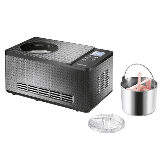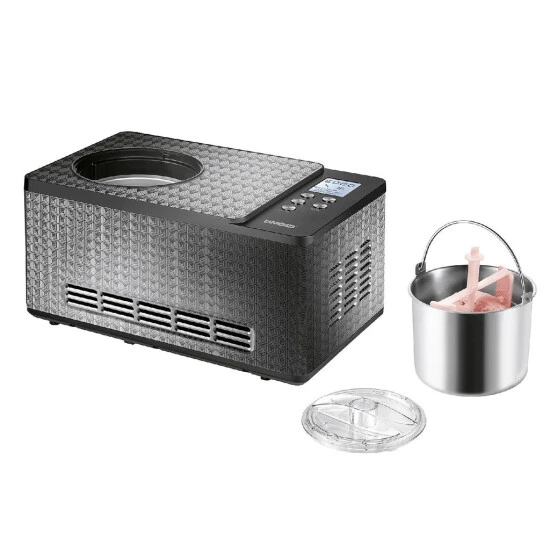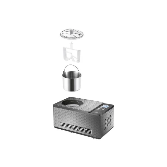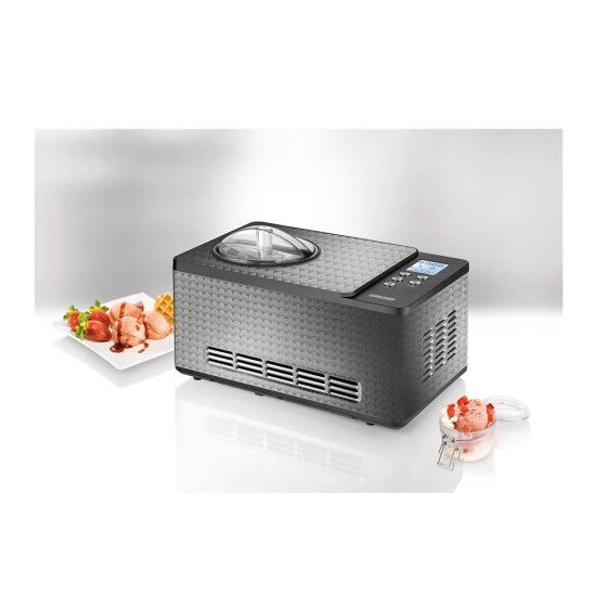 Die Limited Edition Eismaschine 48897 im geprägten Edelstahl-Design mit Kompressor-Kühltechnik hat ein Fassungsvermögen von bis zu 1,5 Liter. Die Eismaschine sorgt mit einem Gefrierbereich von ca. -18°C bis ca. -35°C für die richtige Temperatur und somit ist ein Vorgefrieren im Gefrierschrank nicht mehr nötig. Bei vorgekühlten Zutaten lässt sich so köstliche Sahneeiscreme in nur ca. 30 Minuten zubereiten. Über den praktischen Deckel mit Nachfüllöffnung können die Zutaten ganz einfach nach und nach hinzugefügt werden. Zur Ausstattung gehören ein großes LCD-Display und ein digitaler Timer. Dieser kann von 5 bis 60 Minuten einstellt werden. Dank des entnehmbaren Eisbehälters aus Edelstahl lässt sich die Eismaschine ganz einfach reinigen.