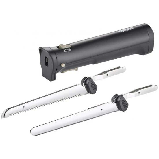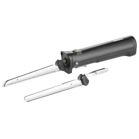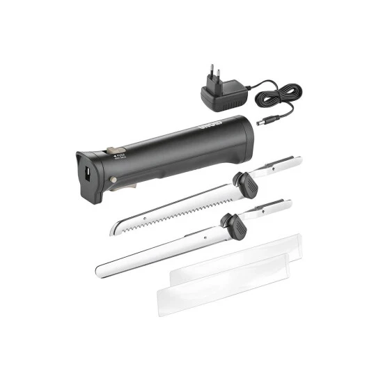 kabelloses Elektromesser mit zwei austauschbaren Edelstahl-Messern (ein Messer mit gezahnter Doppelklinge und ein Glattes), Sicherheitsschalter: 2 Fingerbetrieb für mehr Sicherheit, Akkuladezeit 90 min (Li-Ion-Akku), Steckernetzteil mit Ladeanzeige, Leistung 9 Watt Lieferumfang: Li-Ion-Akku