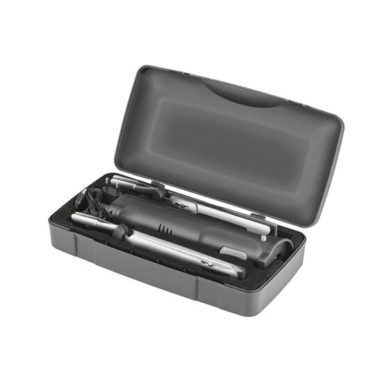 Brot, Torten und viele Gemüsesorten schneidet man ganz bequem mit der spezialgezahnten Doppelklinge. Fleisch, Fisch, Geflügel, Käse, Salami oder Schinken verwandelt das Messer mit glatter Edelstahl-Klinge in appetitliche Stücke oder Scheiben. Nach einer Ladezeit von rund 2,5 Stunden liefert das Elektromesser Cordless circa 45 Minuten Power. Für die Bedienungssicherheit sorgt der Sicherheitsschalter: Das Messer wird ausschließlich mit 2 Fingern bedient da kann absolut nichts passieren! Und wenn gerade nichts geschnitten werden muss, lässt sich der scharfe Küchenpartner ganz einfach auf der Arbeits- oder Tischplatte abstellen. In der praktischen Aufbewahrungsbox kann das Messer samt Klingen und Ladekabel transportiert werden. Das Netzteil zeigt auch zuverlässig den aktuellen Ladestatus an. Zwei Messerschutzhüllen gehören ebenfalls zur Ausstattung, damit die scharfen Klingen immer sicher verstaut sind.