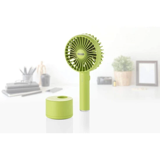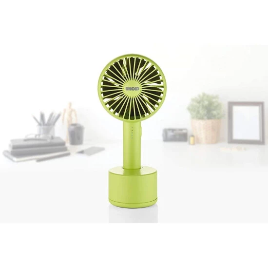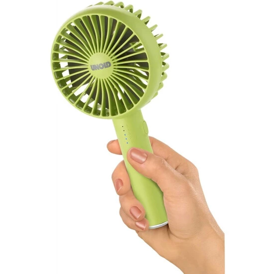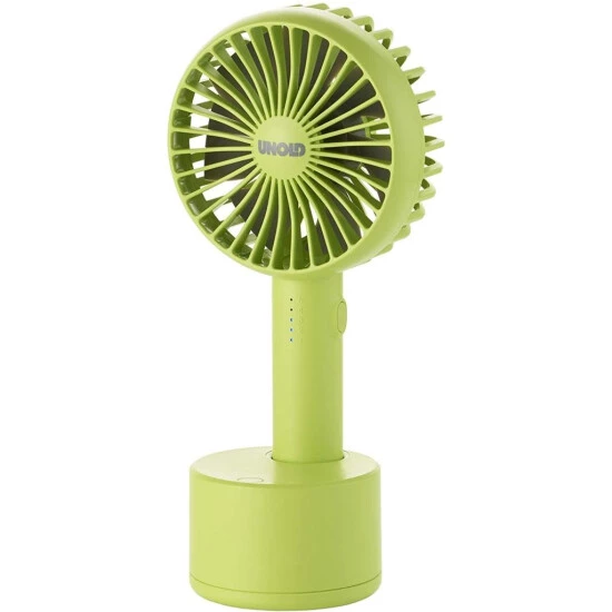 Mit dem Breezy Swing von Unold ist eine erfrischende Brise immer griffbereit. Der kompakte Ventilator kann entweder als Tischventilator oder Handventilator benutzt werden. Auf seinem Standfuß bietet der Breezy Swing optional die 120° Oszillation. Fünf Geschwindigkeitsstufen liefert er auf Knopfdruck. Die LED-Kontrollleuchte zeigt, welche Powerstufe gerade erreicht ist. Je nach Stufe macht der Handventilator Breezy seinen Job circa 2 bis 8 Stunden und danach tankt der Akku in circa 3 Stunden via mitgeliefertem USB-Kabel neue Energie.