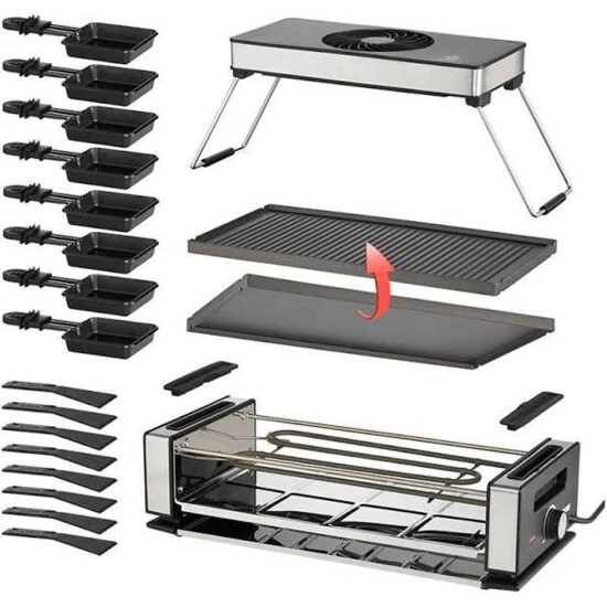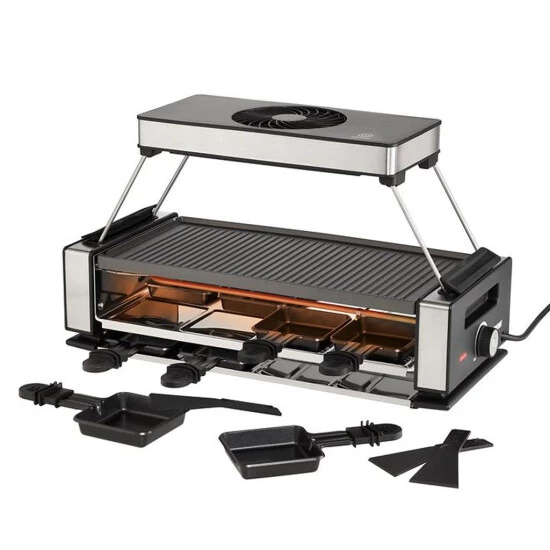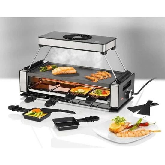 Raclette mit Dunstabzugshaube für bis zu 8 Personen, Abnehmbare Dunstabzugshaube mit 3 Geschwindigkeitsstufen und klappbarem Gestell, austauschbarer Aktivkohlefilter, Wendbare Grillplatte mit Greblon Antihaftbeschichtung.